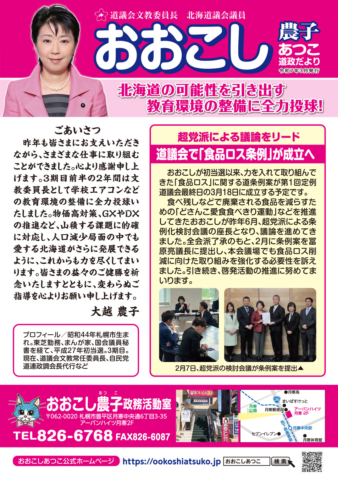 おおこしあつこ 議員活動レポート 道政だより・自由民主のバックナンバーです。 道政だより(R7年4月) 表面PDF 裏面PDF 道政だより(R5年3月) 表面PDF 裏面PDF 道政だより(R4年9月) 表面PDF 裏面PDF 道政だより(R4年3月) 表面PDF 裏面PDF 道政だより(R3年12月) 表面JPG 裏面JPG 道政だより(R2年5月) 表面PDF 裏面PDF 道政だより(R2年5月) 表面PDF 裏面PDF 自由民主(H31年3月) 表面PDF 裏面PDF 自由民主(H31年2月) 表面PDF 裏面PDF 自由民主(H30年12月) 表面PDF 裏面PDF 自由民主(H30年10月) 表面PDF 裏面PDF 道政だより(H30年7月) 表面PDF 裏面PDF 道政だより(H30年3月) 表面PDF 裏面PDF 道政だより(H29年9月) 表面PDF 裏面PDF 道政だより(H29年3月) 表面PDF 裏面PDF 道政だより(H27年12月) 表面PDF 裏面PDF 自由民主(H27年7月) 表面PDF 裏面PDF