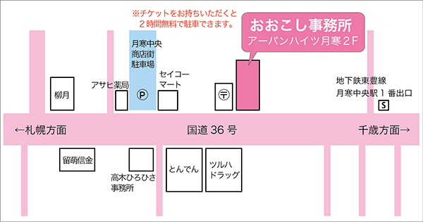 ●公共交通でお越しの場合・・・地下鉄東豊線「月寒中央駅」1番出口から徒歩2分です。